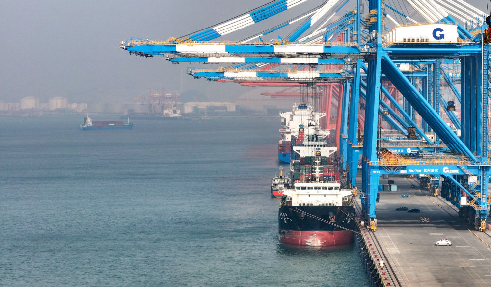 2024年12月31日,遠洋貨輪在欽州港集裝箱自動化碼頭排隊卸貨(無人機照片)。新華社記者 呂帥 攝