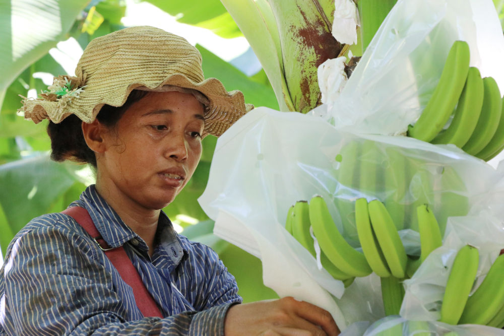 2020年7月17日,工人在柬埔寨桔井省的柬埔寨-中國(guó)熱帶生態(tài)農(nóng)業(yè)合作示范區(qū)給香蕉套袋。