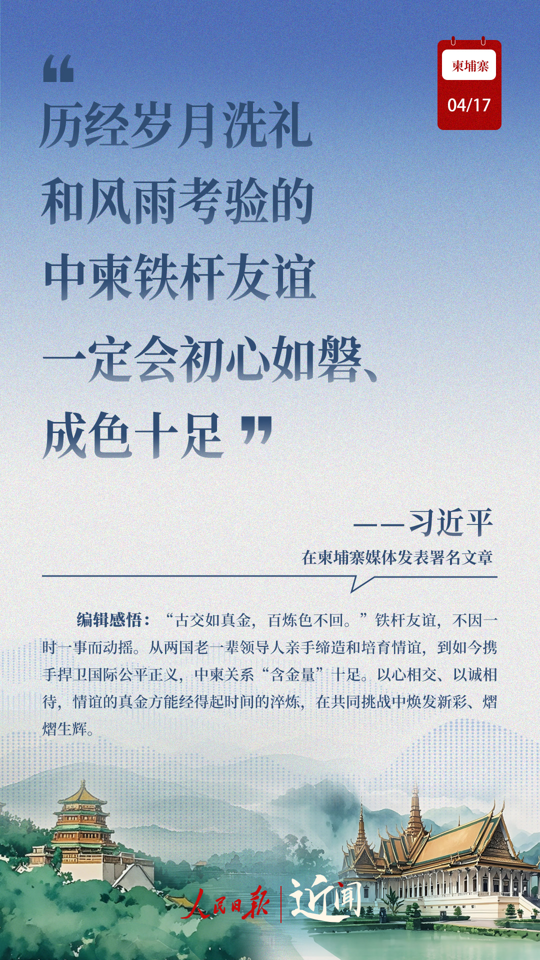 “古交如真金,百煉色不回?!睆膬蓢弦惠咁I(lǐng)導(dǎo)人親手締造和培育兩國友好,到率先構(gòu)建雙邊命運(yùn)共同體,再到構(gòu)建新時(shí)代全天候中柬命運(yùn)共同體,中柬關(guān)系新定位水到渠成。