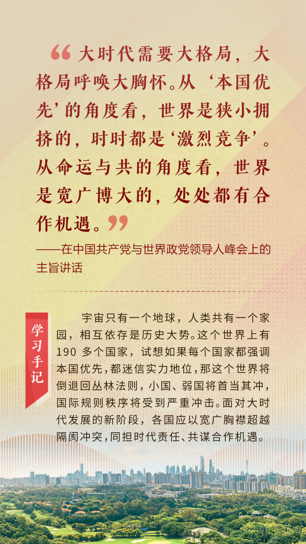 “天空足夠大,地球足夠大,世界也足夠大,容得下各國共同發(fā)展繁榮”“你中有我、我中有你的命運(yùn)共同體”“與中國同行就是與機(jī)遇同行”……習(xí)近平總書記一次次在重要場合發(fā)表重要講話,指引我們站在歷史正確的一邊,站在人類進(jìn)步的一邊,不畏浮云、登高望遠(yuǎn),不懼風(fēng)浪、勇毅前行。