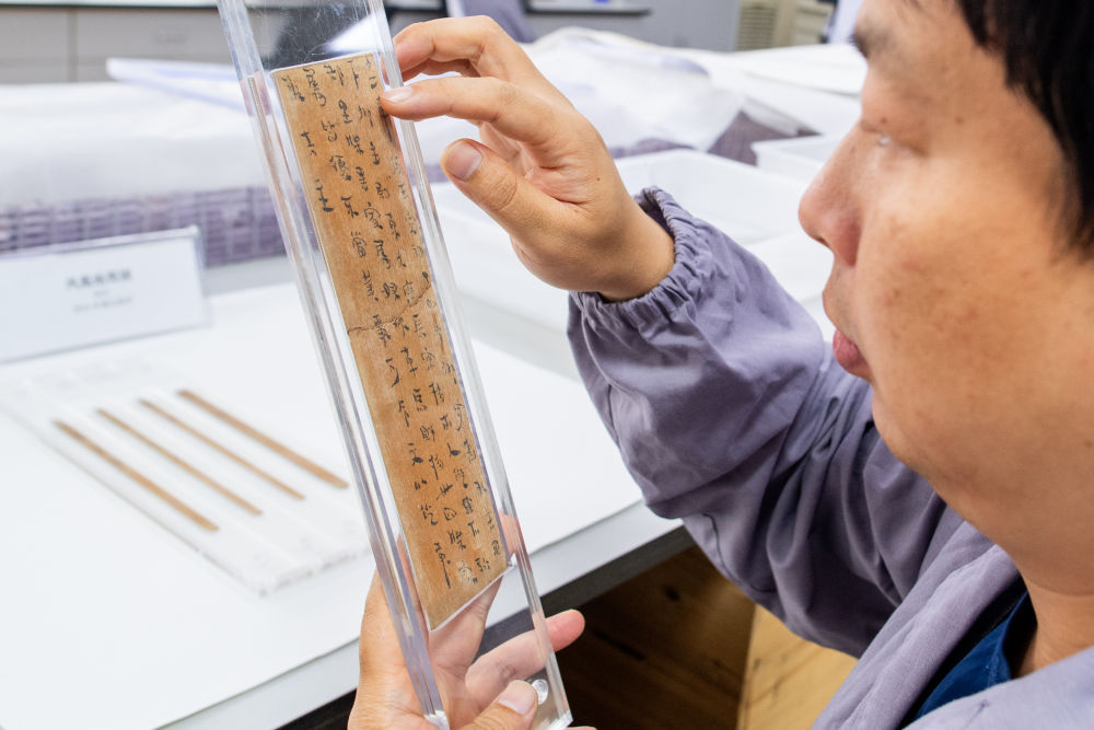 2023年5月20日,湖北荊州文物保護(hù)中心的修復(fù)人員史少華在查看修復(fù)完成的簡牘。荊州文物保護(hù)中心是我國簡牘修復(fù)領(lǐng)域?qū)嵙ψ顝?qiáng)的機(jī)構(gòu)之一,近年來累計完成13萬多枚竹木簡牘的脫水工作,飽水簡牘修復(fù)量占全國90%以上。