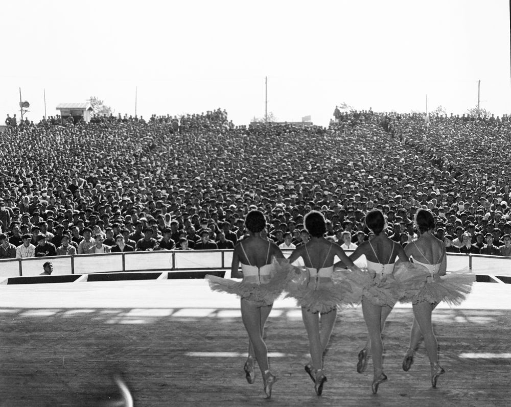 1957年10月,蘇聯(lián)國立新西伯利亞歌劇芭蕾舞劇院為北京石景山鋼鐵廠工人演出。