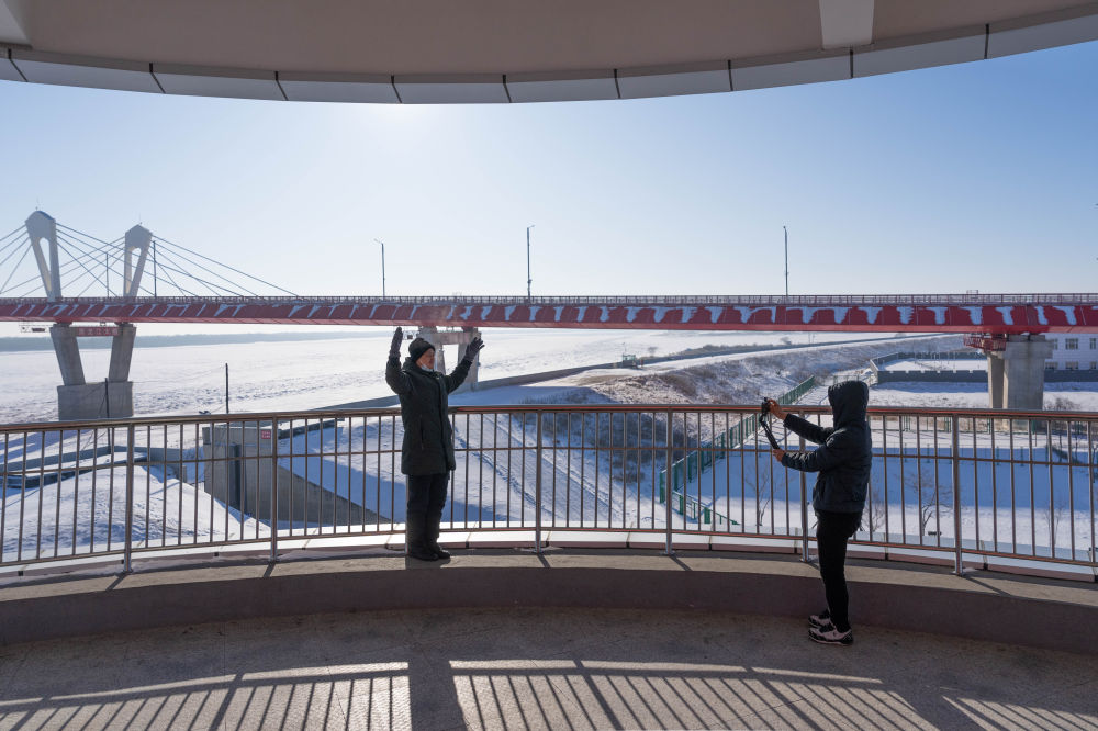 2024年1月30日,游客在黑龍江省黑河市黑龍江大橋公園內(nèi)的觀光塔上留影。黑河—布拉戈維申斯克黑龍江大橋于2022年6月10日正式通車,是中俄首座跨黑龍江(俄羅斯稱阿穆爾河)界河公路橋,在中國東北地區(qū)和俄羅斯遠(yuǎn)東地區(qū)之間開辟了新的國際運輸通道。