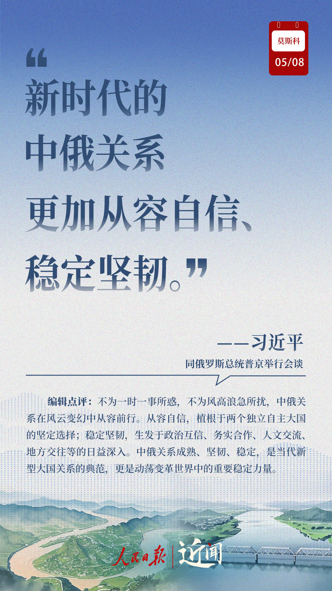 當(dāng)?shù)貢r(shí)間5月8日,習(xí)近平主席出席普京總統(tǒng)舉行的歡迎儀式、小范圍會(huì)談、大范圍會(huì)談、簽字和合作文本交換儀式、共見(jiàn)記者、茶敘,兩國(guó)元首不同形式的長(zhǎng)時(shí)間交流,引領(lǐng)中俄關(guān)系登高望遠(yuǎn)。