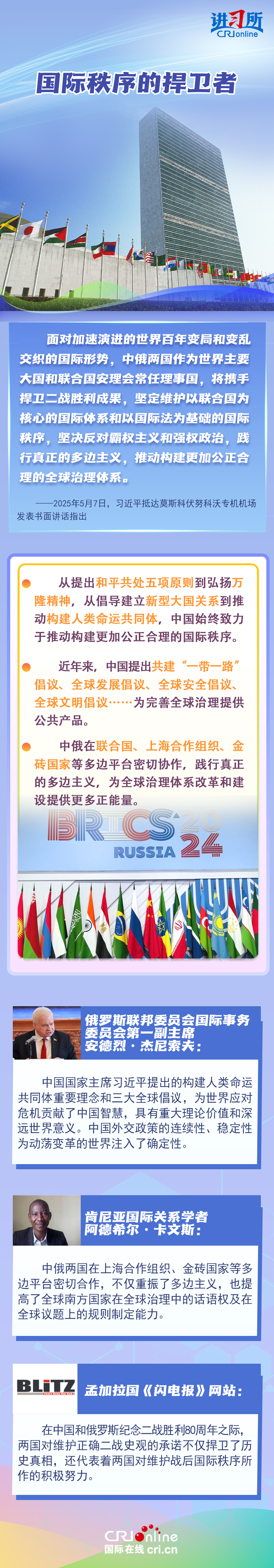 “兩國人民用鮮血和生命凝結(jié)的深厚情誼,如黃河之水奔騰不息,似伏爾加河寬廣深沉,成為中俄世代友好的不竭源泉?!苯衲晔侵袊嗣窨谷諔?zhàn)爭、蘇聯(lián)偉大衛(wèi)國戰(zhàn)爭暨世界反法西斯戰(zhàn)爭勝利80周年,也是聯(lián)合國成立80周年。在這一重要?dú)v史時(shí)間節(jié)點(diǎn),習(xí)近平主席此訪不僅為中俄關(guān)系發(fā)展注入強(qiáng)勁動(dòng)力,也向世界宣示中俄兩國攜手捍衛(wèi)二戰(zhàn)勝利成果的堅(jiān)定意志。