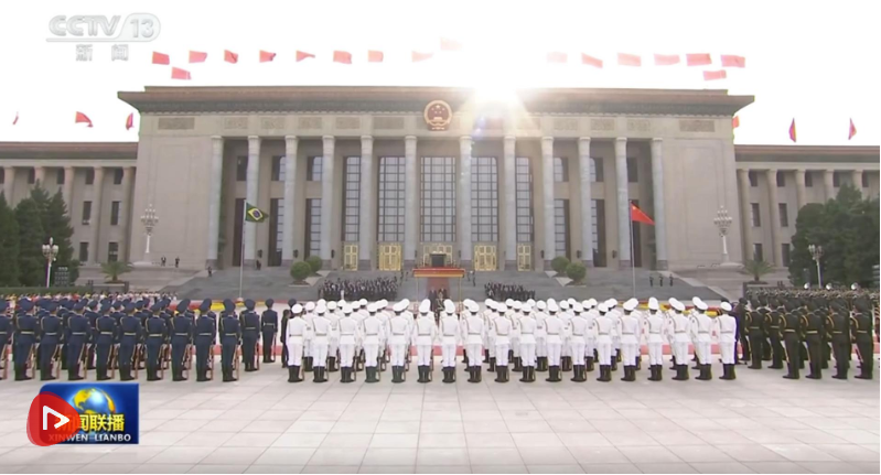 盧拉抵達(dá)時(shí),禮兵列隊(duì)致敬。習(xí)近平同盧拉登上檢閱臺(tái),軍樂團(tuán)奏中巴兩國國歌,天安門廣場鳴放禮炮21響。盧拉在習(xí)近平陪同下檢閱中國人民解放軍儀仗隊(duì),并觀看分列式。