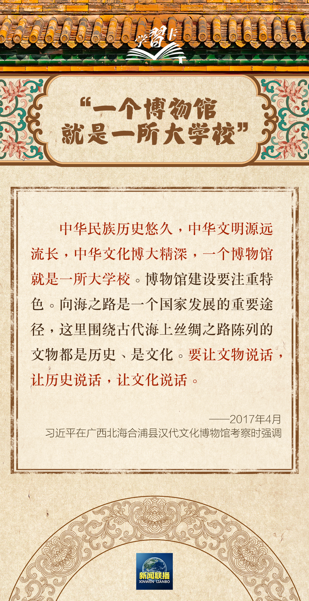 習(xí)近平總書(shū)記一直高度重視博物館工作,經(jīng)?!按蚩ā辈┪镳^,察看具有濃郁文化色彩的展品,對(duì)文物保護(hù)和文化傳承工作作出重要部署。