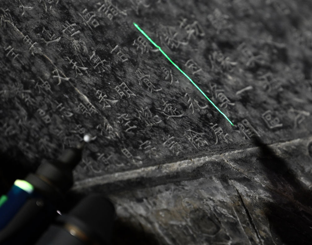 2025年4月9日,龍門石窟研究院工作人員在古陽洞使用關(guān)節(jié)臂掃描儀對《龍門二十品》之一進(jìn)行數(shù)字化掃描。新華社記者 李嘉南 攝