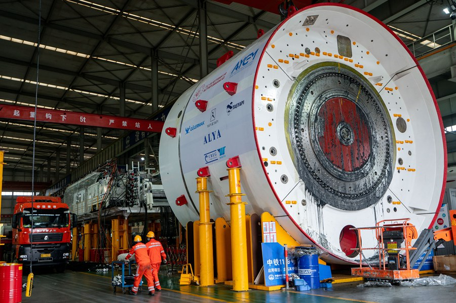 2022年11月23日,工人在中鐵裝備集團(tuán)車間內(nèi)運(yùn)輸掘進(jìn)機(jī)零部件。新華社發(fā)