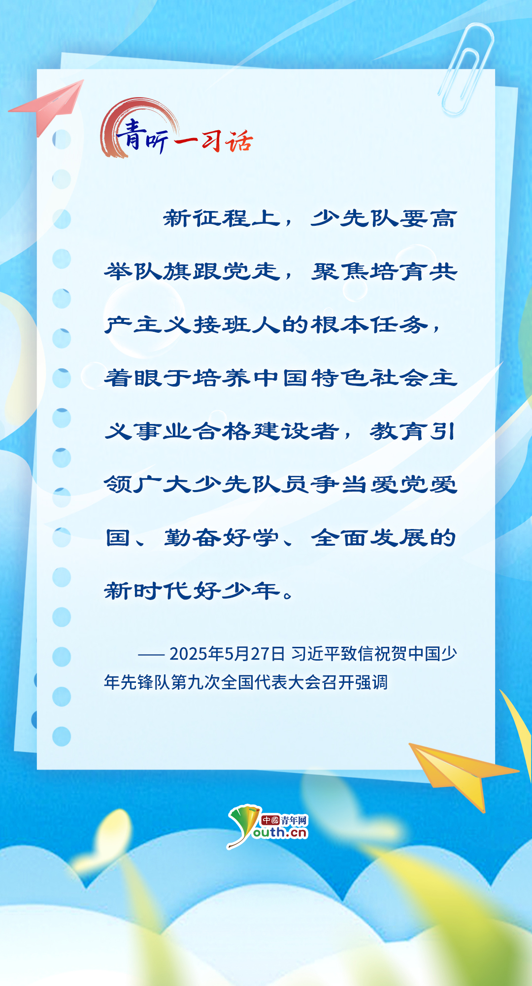 “孩子們成長(zhǎng)得更好,是我們最大的心愿?!秉h的十八大以來,習(xí)近平總書記關(guān)心關(guān)愛少年兒童成長(zhǎng)成才,為少先隊(duì)工作指明前進(jìn)方向,從“六一”國(guó)際兒童節(jié)的殷殷寄語,到外出考察時(shí)的點(diǎn)滴關(guān)懷……少年兒童的健康成長(zhǎng)和全面發(fā)展,一直是總書記心中最溫柔的牽掛。在今年“六一”國(guó)際兒童節(jié)到來之際,讓我們一起重溫總書記對(duì)少年兒童的諄諄教誨、美好祝愿,感受總書記對(duì)少年兒童的深情牽掛、殷切期望。(海報(bào)制作:張潔)