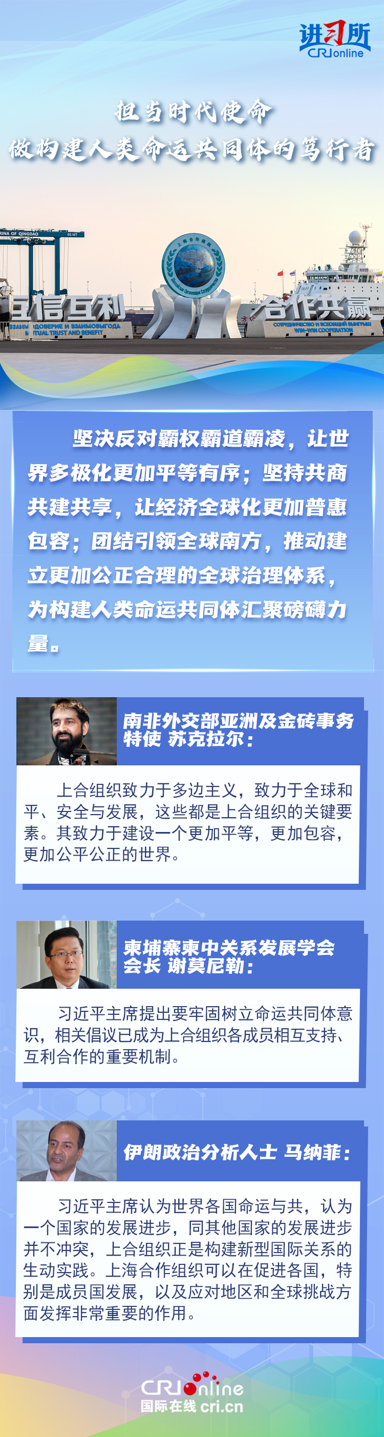 “讓‘上海精神’持續(xù)照亮構(gòu)建上海合作組織命運共同體之路?!鄙虾:献鹘M織成立24年來,始終秉持“上海精神”,成功走出了一條順應(yīng)時代潮流、契合各方需求的區(qū)域合作道路,樹立起新型國際關(guān)系的典范。在國際人士眼中,上海合作組織站在歷史正確一邊,致力于建設(shè)一個更加平等,更加包容,更加公平公正的世界,對維護地區(qū)和全球和平至關(guān)重要。