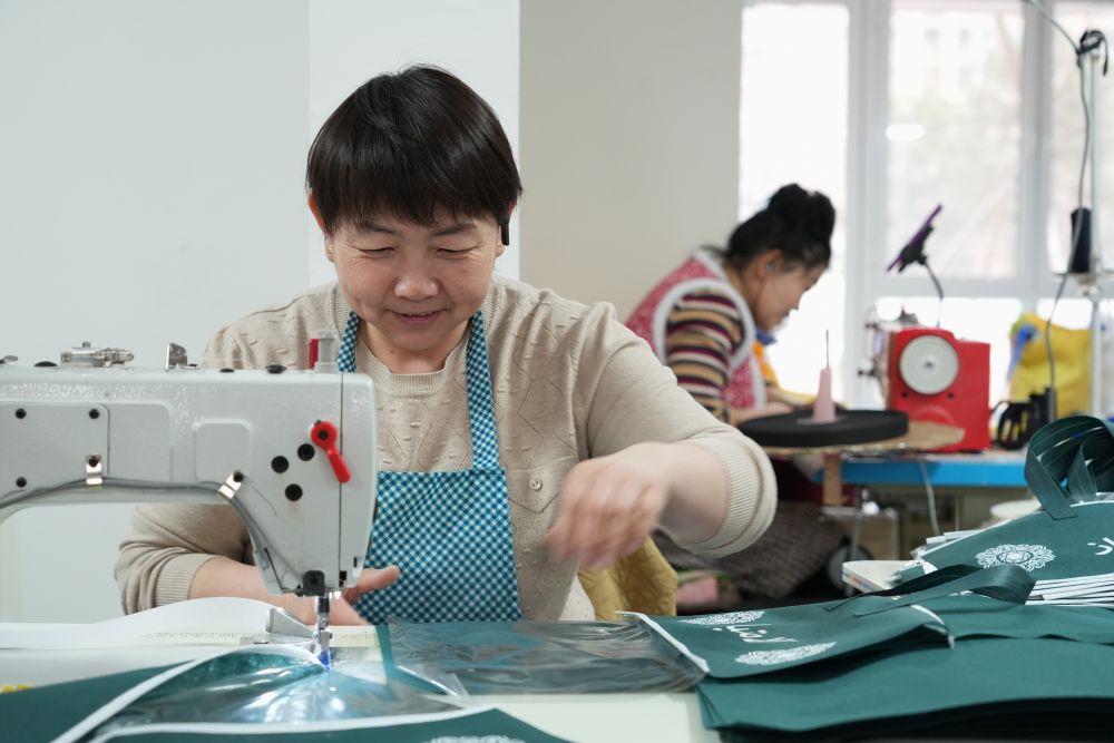 2025年3月27日,回遷居民在雄安新區(qū)“雄業(yè)創(chuàng)工坊”包裝工坊加工無紡布。工坊引入有持續(xù)發(fā)展?jié)摿?、對社區(qū)環(huán)境影響較小的產業(yè),為回遷群眾提供靈活多樣的就業(yè)崗位,讓回遷居民實現(xiàn)“上樓安家,下樓就業(yè)”。