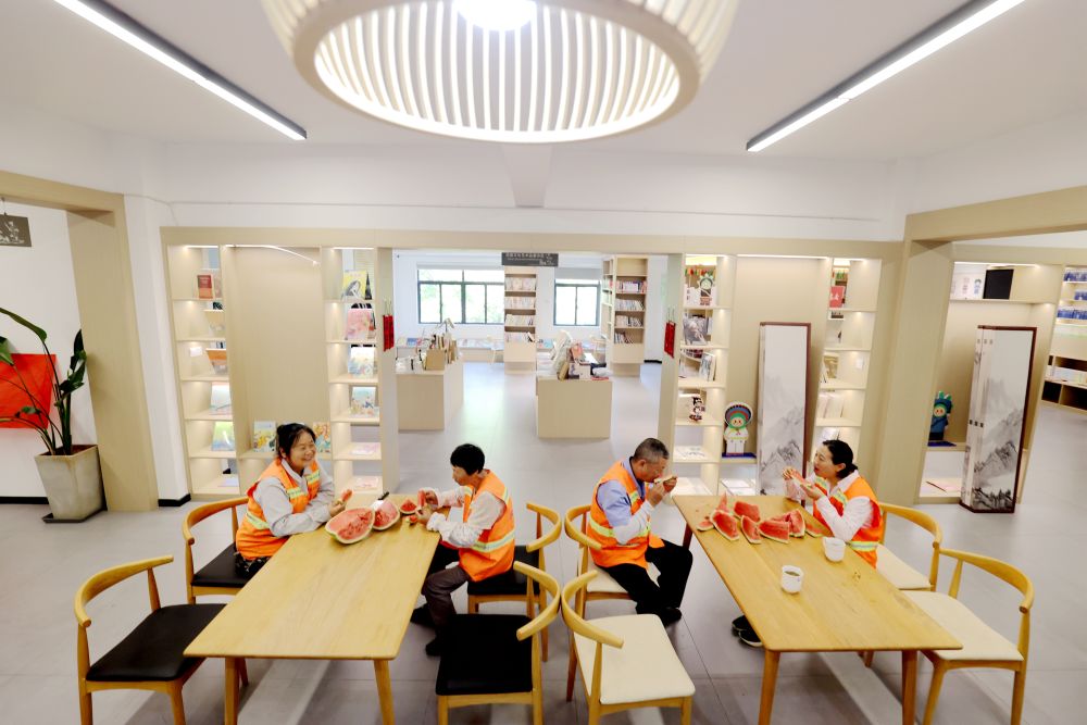 2024年8月6日,在浙江省湖州市阜溪街道興山社區(qū)工會驛站,環(huán)衛(wèi)工人在工作間隙休憩納涼。