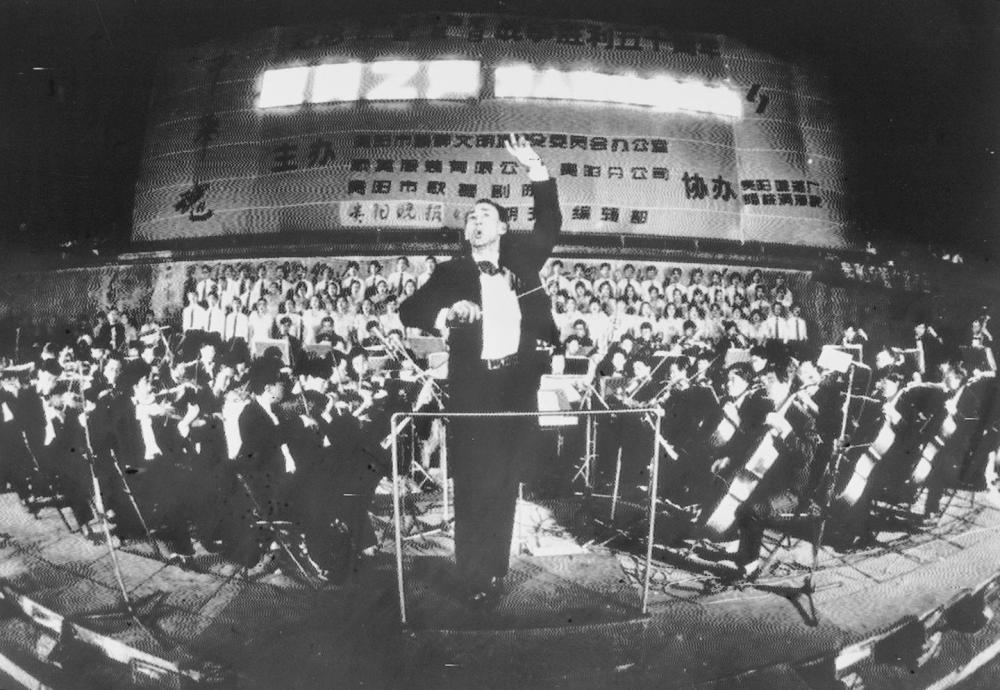 1995年8月15日,在貴陽(yáng)市人民廣場(chǎng)舉行的萬(wàn)人露天交響音樂(lè)會(huì)上,演員和萬(wàn)余名市民高唱《義勇軍進(jìn)行曲》。