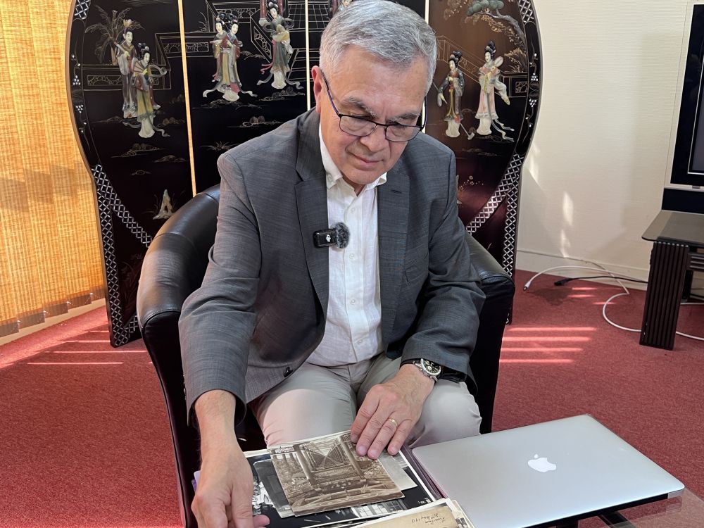 2025年6月23日,貝石濤在巴黎近郊接受記者采訪時(shí)翻看與貝熙業(yè)醫(yī)生相關(guān)的歷史資料。新華社記者 孫鑫晶 攝