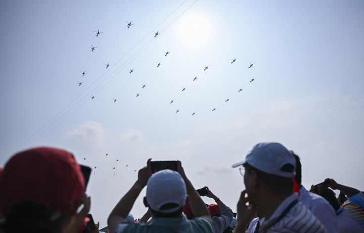 9月3日,習(xí)近平總書記同來自五大洲的外國友人并肩站立在天安門城樓上。26架直升機組成巨大的“80”字樣飛過,眾人仰首凝望。