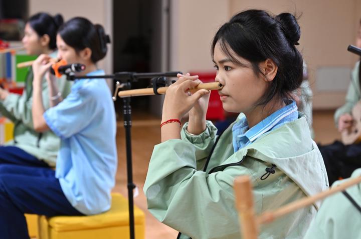 2025年6月12日,海南省民族技工學(xué)校學(xué)生在練習(xí)黎族鼻簫。近年來(lái),海南省五指山市打造“非遺進(jìn)校園”工程,在14所公辦中小學(xué)開(kāi)設(shè)非遺課程,培養(yǎng)青少年對(duì)中華優(yōu)秀傳統(tǒng)文化的熱愛(ài),助力非遺傳承與發(fā)展。