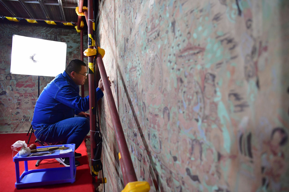 2022年4月19日,敦煌研究院文物保護技術服務中心的壁畫修復師楊金禮在莫高窟第231窟內(nèi)修復壁畫。