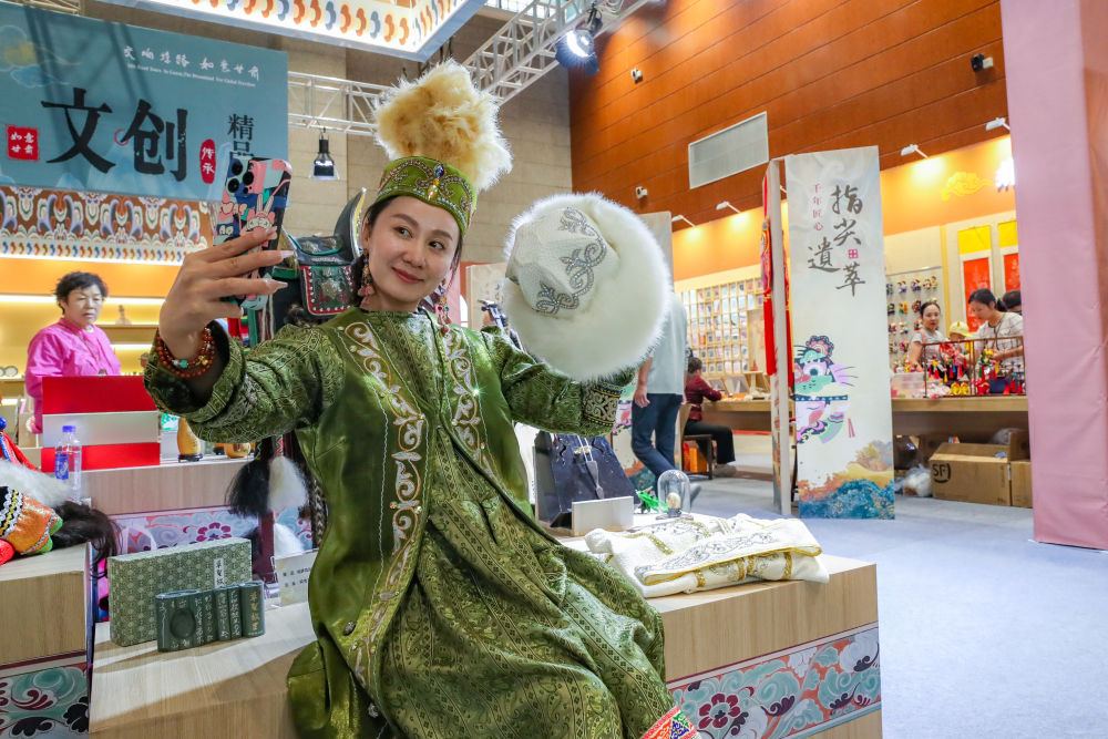 2025年9月22日,游客在敦煌文博會上身穿民族服飾自拍。9月20日至22日,第八屆絲綢之路(敦煌)國際文化博覽會在敦煌市舉行。敦煌研究院“典范”“高地”建設成果展、甘肅文旅非遺文創(chuàng)展、敦煌·絲路雕塑展等多項展覽同步亮相,集中展現(xiàn)了敦煌文化遺產(chǎn)保護、研究、弘揚的最新成果以及共建“一帶一路”國家的文化藝術、非遺文創(chuàng)、風土人情等精彩內(nèi)容。