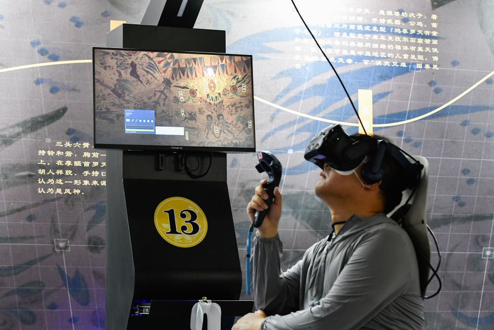 2024年7月22日,一名游客在敦煌莫高窟“尋境敦煌——數(shù)字敦煌沉浸展”上借助VR設備沉浸式游覽莫高窟第285窟虛擬場景。“尋境敦煌”綜合運用了VR虛擬現(xiàn)實、三維建模、游戲引擎的物理渲染和全局動態(tài)光照等新技術,高精度立體還原了莫高窟第285窟。游客戴上VR眼鏡,不僅可以零距離觀賞壁畫、360度自由探索洞窟細節(jié),還能“飛升”到窟頂,身臨其境參與壁畫故事情節(jié),沉浸式感受敦煌文化的魅力。