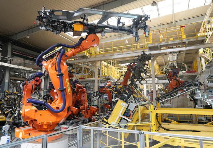 在位于浙江省臨海市的吉利汽車制造基地,機(jī)械臂在焊裝車間工作。新華社記者 翁忻旸 攝