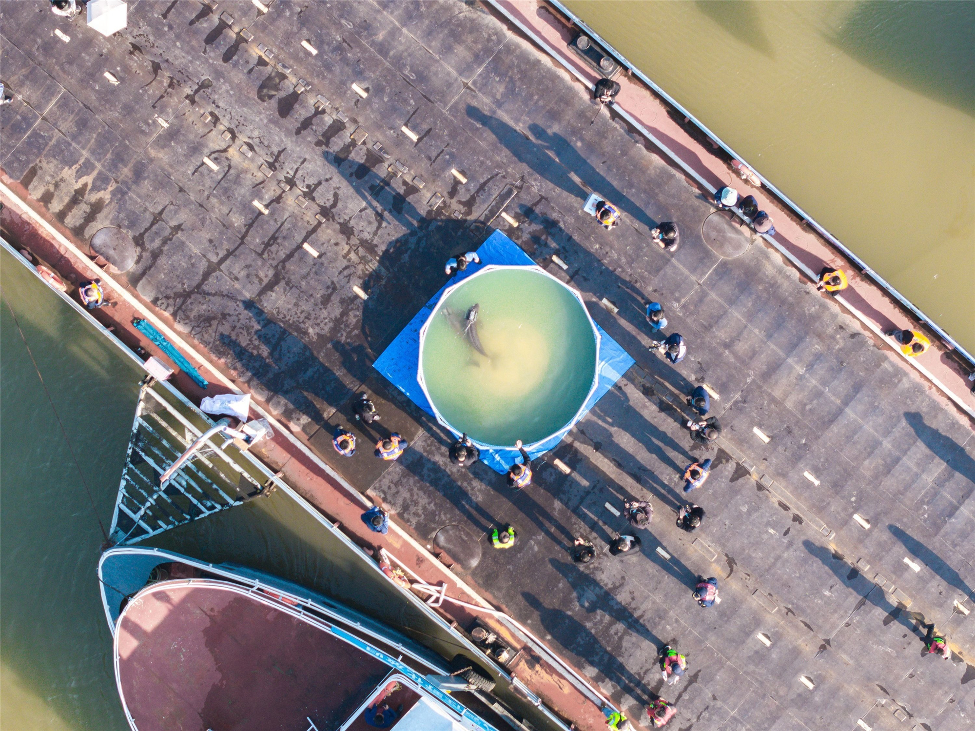 兩只長江江豚回歸長江前,在駁船上的“舒緩池”中游弋