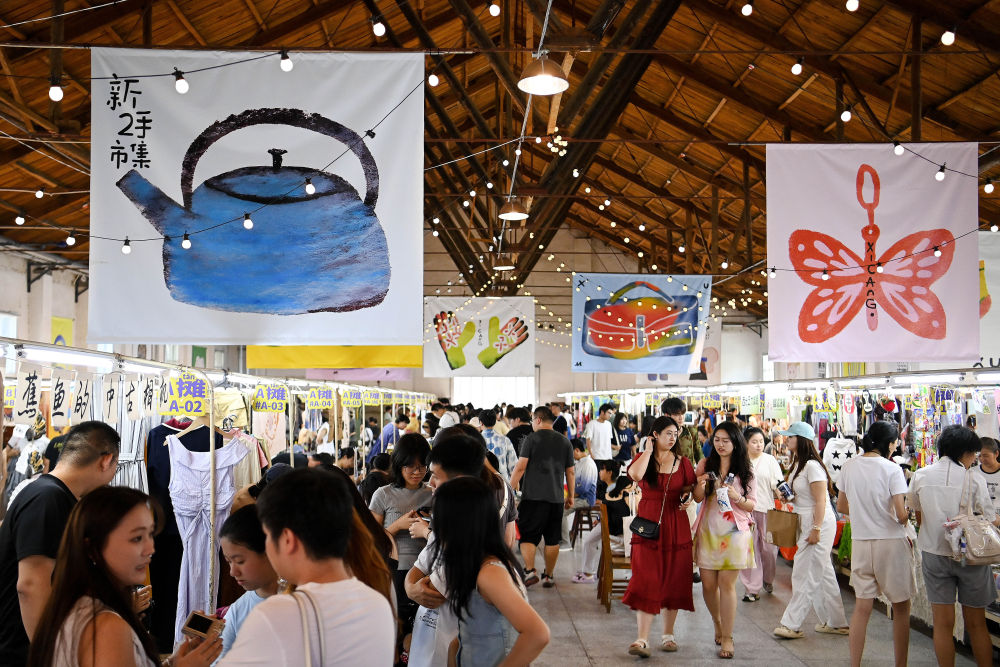 2025年7月5日,游客在西安西倉(cāng)市集文創(chuàng)公園內(nèi)的“新二手市集”上參觀(guān)游覽。2024年以來(lái),西安對(duì)西倉(cāng)區(qū)域?qū)嵤拔⒏?、輕改造”,在保留核心區(qū)傳統(tǒng)集市風(fēng)貌的基礎(chǔ)上,升級(jí)改造原有設(shè)施,建設(shè)西倉(cāng)市集文創(chuàng)公園,打造“復(fù)合型文化消費(fèi)新場(chǎng)景”;通過(guò)引入創(chuàng)新業(yè)態(tài)、開(kāi)設(shè)“新二手市集”等方式,讓咖啡潮玩、非遺體驗(yàn)、城市記憶展覽等年輕化元素與市井煙火相融共生,使老城核心區(qū)在“微更新”中持續(xù)煥發(fā)新活力。