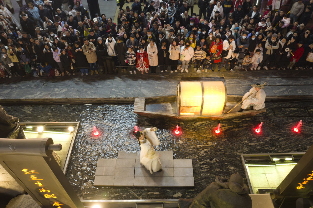 游客在西安大唐不夜城景區(qū)觀(guān)看以唐代歷史文化為背景創(chuàng)作的情景?。o(wú)人機(jī)照片,2025年1月22日攝)。