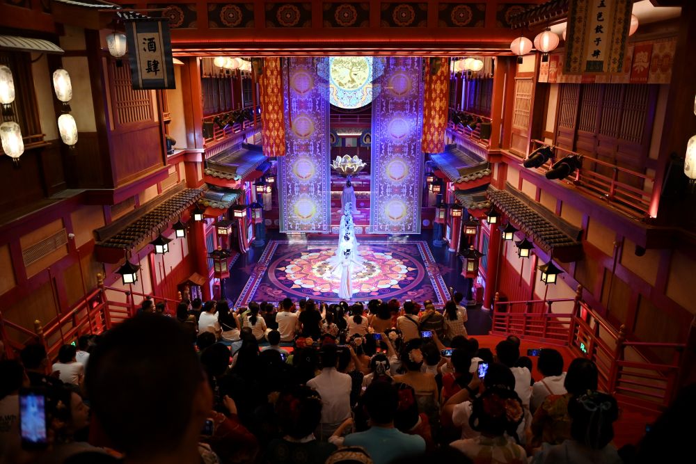 2024年5月12日,游客在西安長(zhǎng)安十二時(shí)辰主題街區(qū)內(nèi)觀(guān)看演出。街區(qū)通過(guò)漢服旅拍、演藝互動(dòng)、非遺體驗(yàn)等項(xiàng)目,讓游客“穿越”回盛唐長(zhǎng)安,為游客打造科技感、文化味十足的游歷體驗(yàn)。