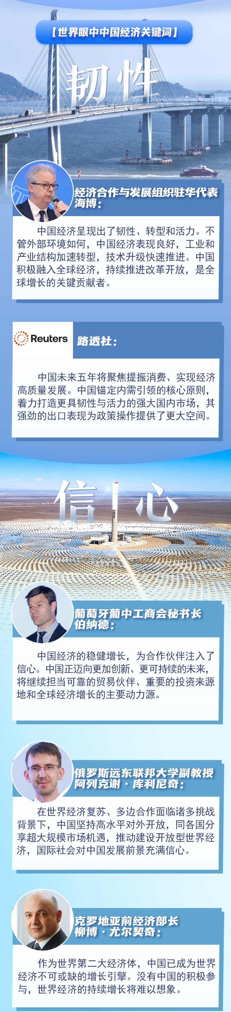近期,多家國際機構(gòu)上調(diào)中國經(jīng)濟增長預期,多國人士及媒體認為,中國是世界經(jīng)濟增長的重要引擎和創(chuàng)新前沿。韌性、信心、動力、開放,成為世界眼中的中國經(jīng)濟關(guān)鍵詞。