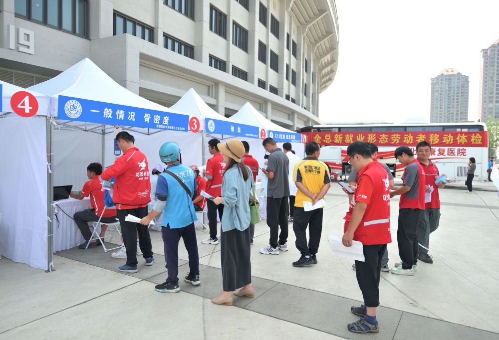 2024年6月13日,中華全國總工會在北京工人體育場舉辦新就業(yè)形態(tài)勞動者移動體檢專項工作啟動儀式,現(xiàn)場為數(shù)百名貨車司機、網(wǎng)約車司機、快遞員、外賣配送員等提供內(nèi)外科、生化、心電、超聲等項目檢查。2024年,各級工會為全國超過50萬名新就業(yè)形態(tài)勞動者提供移動體檢服務,建立新就業(yè)形態(tài)勞動者職業(yè)健康檔案庫。