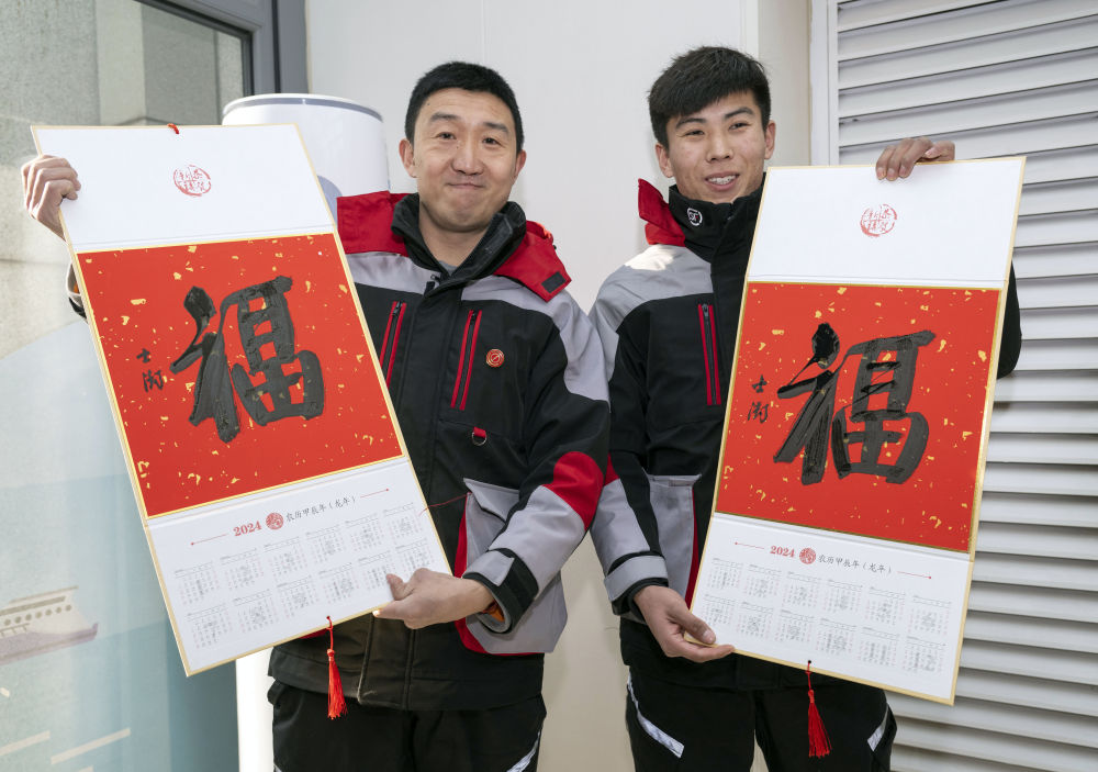 2024年1月16日,在北京的中國職工之家工會驛站舉行的萬福迎春——2024年“送萬福、進萬家”書法公益活動上,快遞小哥展示福字。