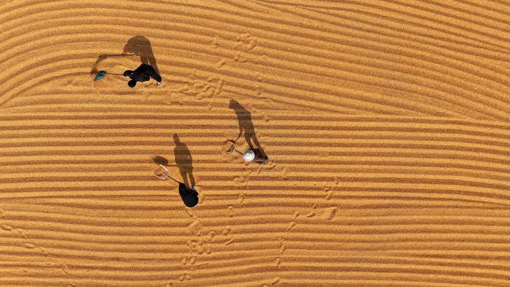 2025年10月28日,在山東省棗莊市市中區(qū)稅郭鎮(zhèn),農(nóng)民晾曬收獲的玉米(無人機(jī)照片)。