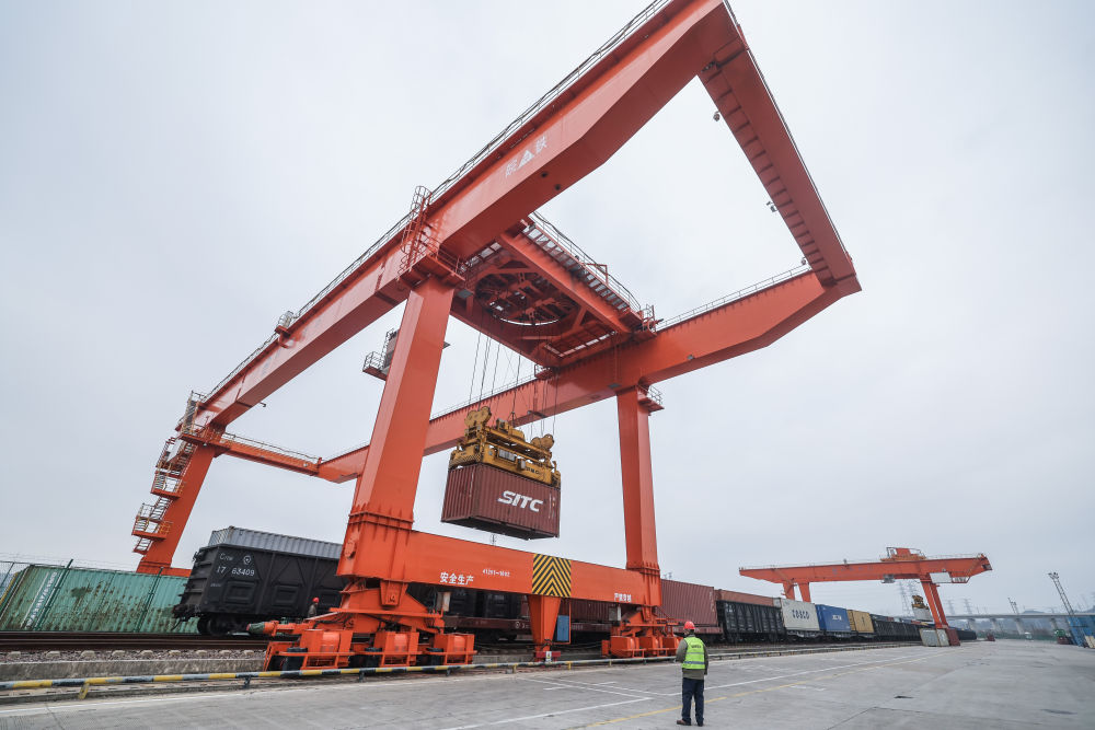 2026年1月30日,在浙江義烏鐵路口岸,一列載著紅酒、葵花籽油、氣泡水等進(jìn)口商品的中歐班列回程班列在卸貨。新華社記者 徐昱 攝