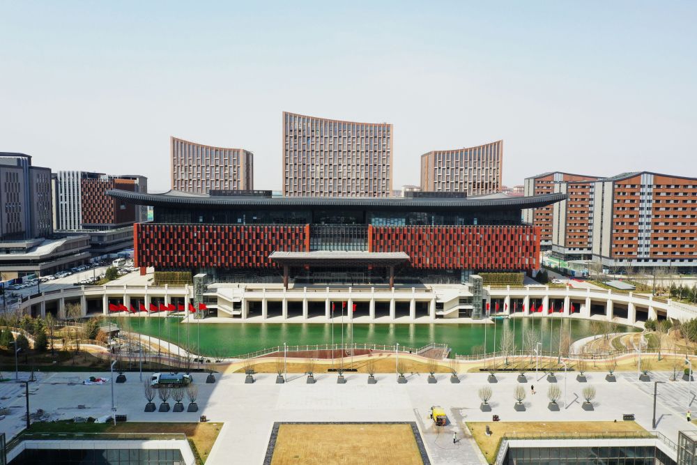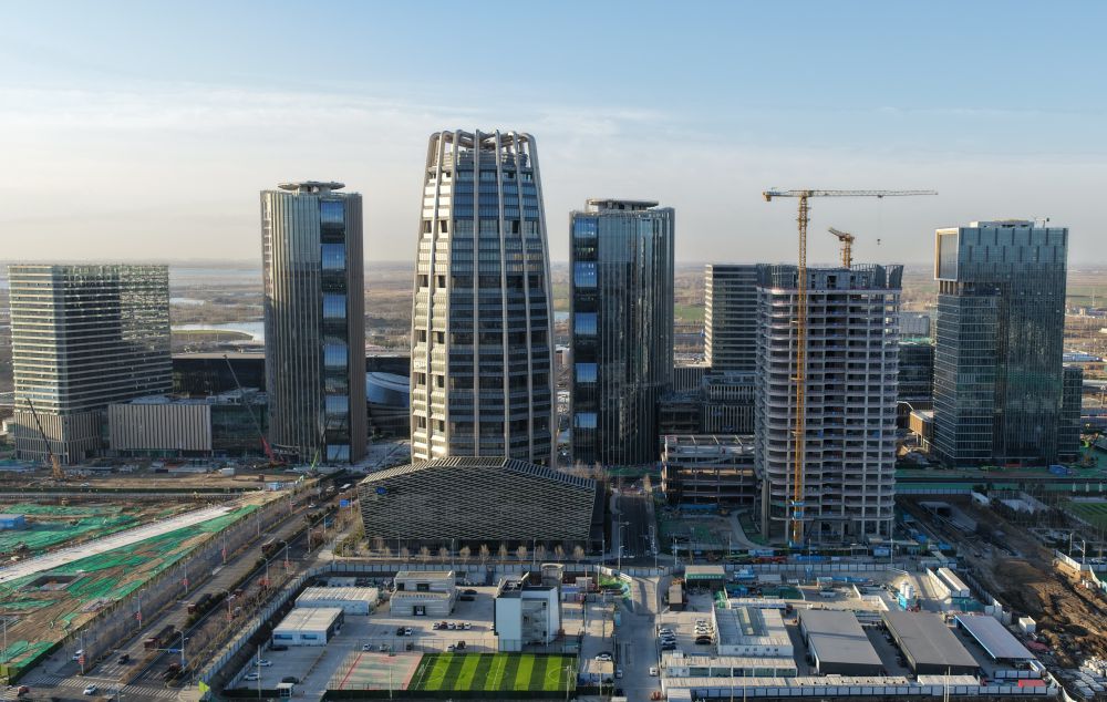 雄安商務(wù)服務(wù)中心是新區(qū)首個標(biāo)志性城市建筑群,建筑風(fēng)格以東方美學(xué)立體展現(xiàn)雄安特色風(fēng)貌,功能包括酒店、專家公寓、商業(yè)等。2022年底,該中心投入使用。通過綠色建筑技術(shù)的集成與創(chuàng)新,這里實現(xiàn)了綠建三星標(biāo)準(zhǔn)全覆蓋,項目預(yù)計每年可節(jié)約用電1100萬度。這是2022年3月28日拍攝的雄安商務(wù)服務(wù)中心。