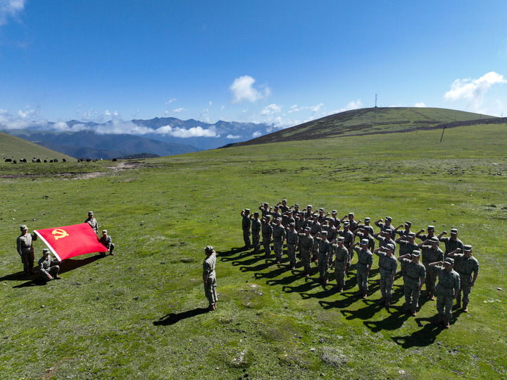 西部戰(zhàn)區(qū)空軍某團遠程機動訓練途中組織官兵舉行重溫入黨誓詞活動(2025年6月30日攝,無人機照片)。