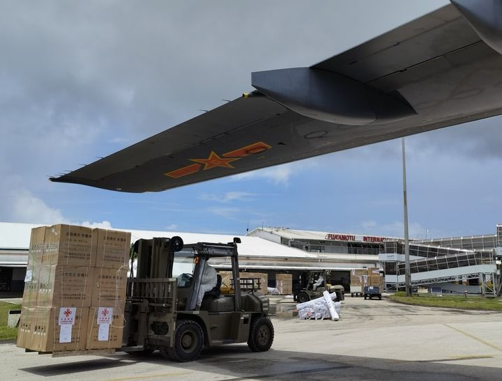 工作人員在湯加首都努庫阿洛法機場卸載中國運-20飛機運送來的援助物資(2022年1月28日攝,手機照片)。