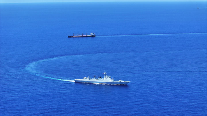 中國海軍第46批護航編隊焦作艦(下)護送貨船至解護點后與之分航(2024年5月7日攝)。