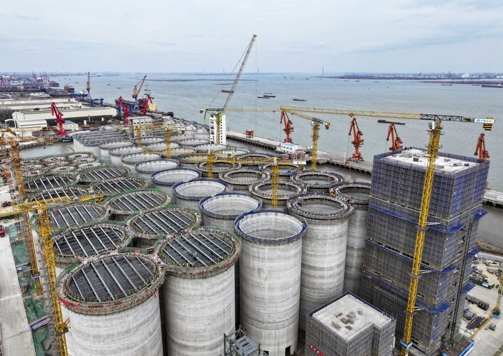 在江蘇省靖江市拍攝的中糧靖江碼頭倉(cāng)儲(chǔ)物流項(xiàng)目建設(shè)現(xiàn)場(chǎng)(2025年2月20日攝,無(wú)人機(jī)照片)。新華社發(fā)(顧繼紅攝)