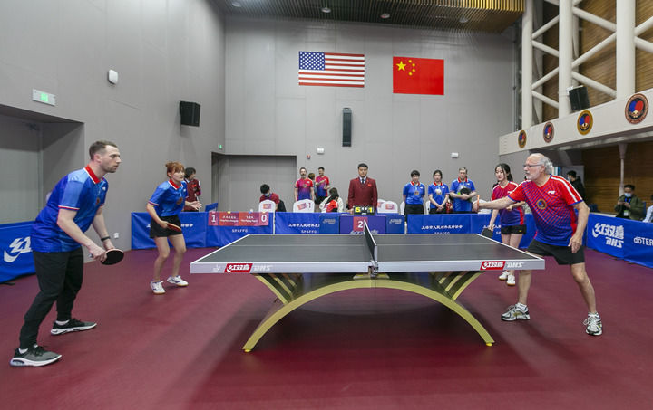 2021年4月10日,上海舉行紀(jì)念中美“乒乓外交”50周年系列活動。這是中美選手參加乒乓球友誼賽。新華社記者 王翔 攝