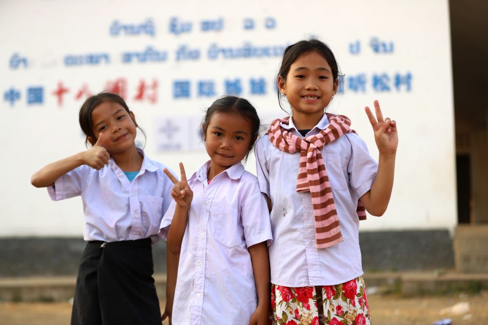 聽松村的孩子們在中資企業(yè)援建的學(xué)校里合影。新華社發(fā) 杜大鵬 攝
