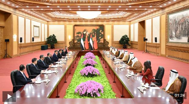哈立德說:“主席閣下,阿聯(lián)酋和中國的關(guān)系歷史悠久、根基深厚。阿聯(lián)酋高度重視同中國的伙伴關(guān)系。我們致力于進一步推動兩國關(guān)系向前發(fā)展,開拓更廣闊的前景。”