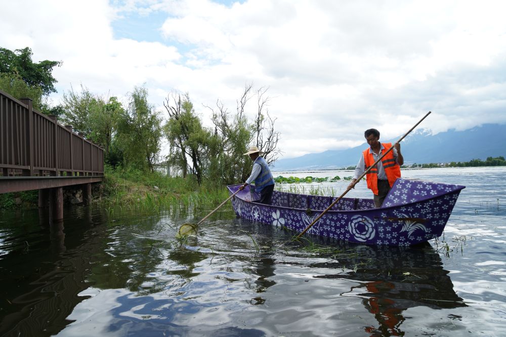大理市灣橋鎮(zhèn)古生村位于洱海邊,是一個(gè)典型的白族傳統(tǒng)村落,已有1000多年歷史。近年來,當(dāng)?shù)刈ゾo抓實(shí)洱海生態(tài)治理,古生村也因此受益,游客數(shù)量逐漸增加,當(dāng)?shù)卮迕癯掷m(xù)增收。這是2020年9月14日,村民在大理市灣橋鎮(zhèn)古生村水域清理水草。