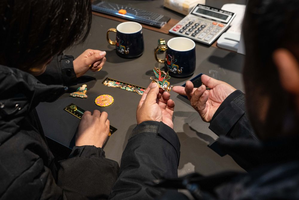 2026年1月15日,云南麗江白沙壁畫博物館館長(zhǎng)楊志堅(jiān)(右)與同事討論文創(chuàng)產(chǎn)品設(shè)計(jì)。近年來,白沙壁畫博物館持續(xù)推動(dòng)白沙壁畫赴廣東、上海等地展覽,主持編纂畫冊(cè),并推進(jìn)數(shù)字化采集和文創(chuàng)開發(fā),讓壁畫藝術(shù)以新的形式走進(jìn)人們的日常生活。