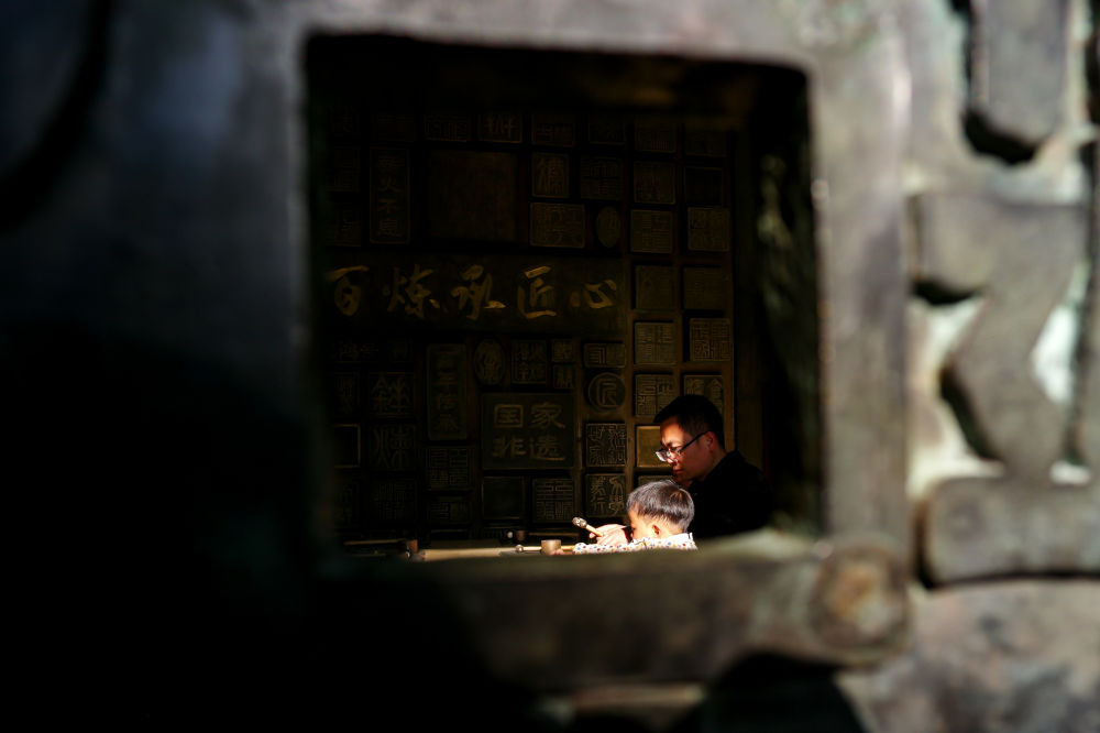 2026年3月25日,在云南曲靖會(huì)澤縣國家級(jí)非遺斑銅制作技藝傳習(xí)館,張氏斑銅第十三代傳人張偉在教兒子敲打銅器。會(huì)澤以“保護(hù)優(yōu)先、匠心修復(fù)、多元活化、融合共生”為路徑推進(jìn)古城活化保護(hù),對(duì)會(huì)館、民居等古建筑匠心修繕、活化利用,同時(shí)保留居民生活業(yè)態(tài),常態(tài)開展特色文化活動(dòng),用微改造提升古城環(huán)境。