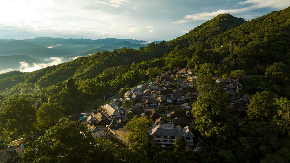 景邁山是云南普洱茶區(qū)最具標(biāo)志意義的一座古茶山,其古茶林是世界上保存完整、面積較大、種植歷史悠久的人工栽培古茶林典型代表。2013年以來,當(dāng)?shù)仃懤m(xù)實(shí)施村寨文物保護(hù)展示、消防防雷及古茶林監(jiān)測(cè)項(xiàng)目,優(yōu)先采用傳統(tǒng)工藝、傳統(tǒng)材料,延續(xù)傳統(tǒng)干欄式民居建筑結(jié)構(gòu)、特征和風(fēng)貌,并進(jìn)行適應(yīng)性改造和性能提升,在保護(hù)傳承遺產(chǎn)真實(shí)性、完整性的同時(shí),推動(dòng)遺產(chǎn)保護(hù)成果惠及當(dāng)?shù)厝罕姟?023年9月,“普洱景邁山古茶林文化景觀”被列入《世界遺產(chǎn)名錄》,成為全球首個(gè)茶主題世界文化遺產(chǎn)。這是被山林與茶園環(huán)繞的云南景邁山翁基古寨一景(無人機(jī)照片,2023年9月18日攝)。