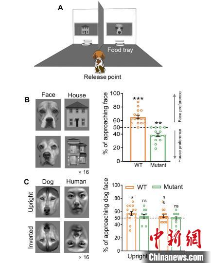 本次研究成果相關(guān)示意圖:Shank3突變?nèi)梅孔樱吧腿妹婵?;野生型犬偏好同類面孔,而突變?nèi)疀]有這種偏好。中國科學院遺傳發(fā)育所 供圖