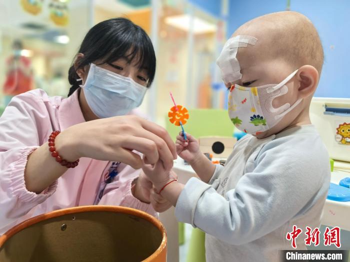 4月15日,湖南省兒童醫(yī)院血液腫瘤科新陽(yáng)光病房學(xué)校內(nèi),17歲的實(shí)習(xí)護(hù)士小雯(化名)正在和白血病患兒做手工。她說,看著他們仿佛就看到了從前的自己,想做“執(zhí)炬人”,為病痛中的孩子傳遞希望。