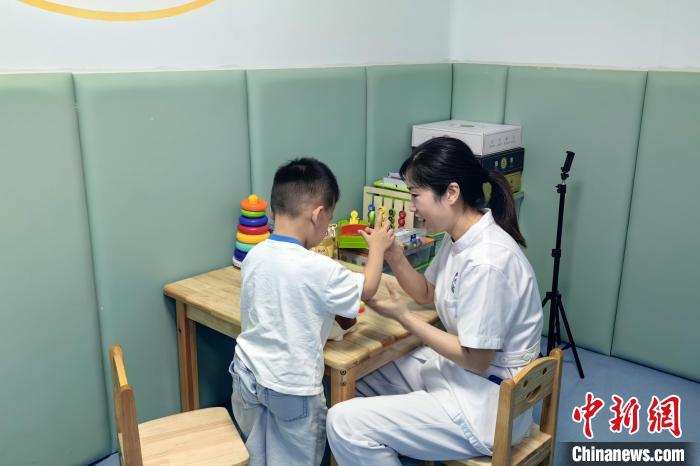 6月6日,在南昌大學(xué)第一附屬醫(yī)院贛江新區(qū)醫(yī)院,醫(yī)護人員為孤獨癥兒童提供康復(fù)幫扶。江西省殘疾人福利基金會 供圖