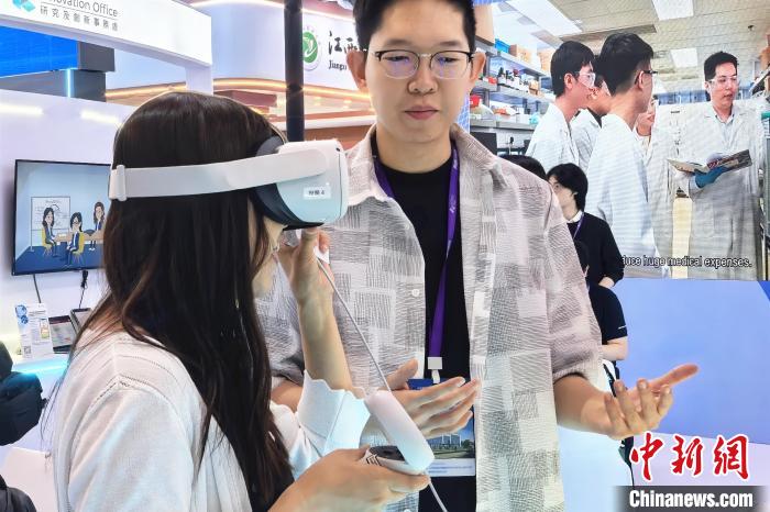 6月7日,在第四屆中國(guó)(南昌)國(guó)際大健康產(chǎn)業(yè)大會(huì)暨博覽會(huì)現(xiàn)場(chǎng),一位觀眾體驗(yàn)香港理工大學(xué)推出的虛擬步行訓(xùn)練系統(tǒng)。中新社記者 吳鵬泉 攝